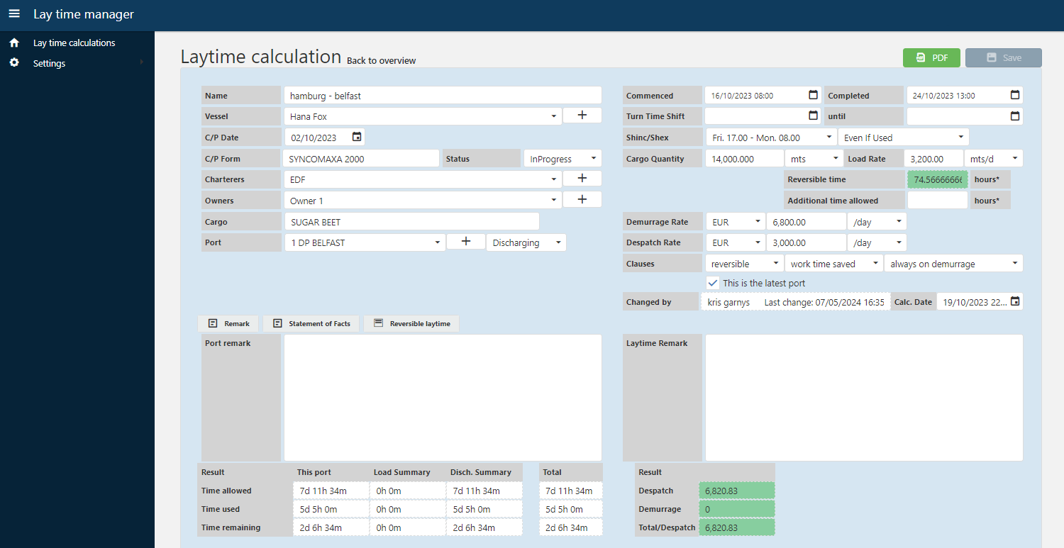 Demurrage Despatch Laytime calculator, for Laytime calculator for the dry bulk shipping industry, SHex and SOF fully customizable, PDF document generation and more easy to use features.